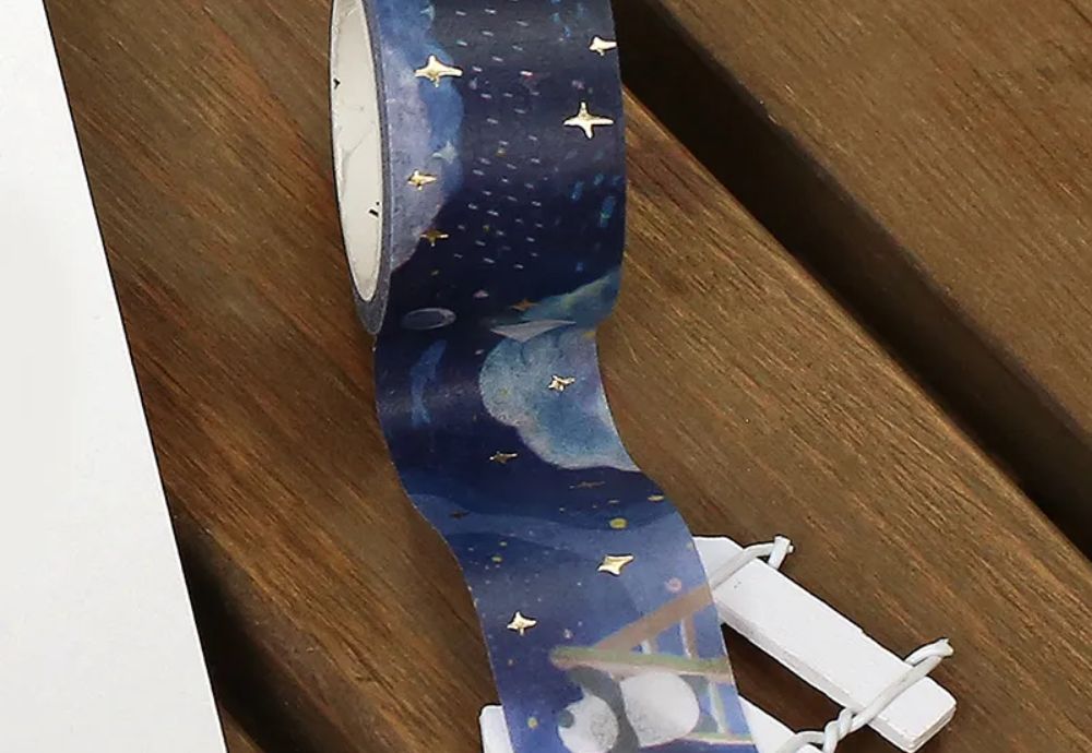 Taśma washi BGM Little World * Galactic Island o szerokości 20 mm i długości 5 m, wykonana z wysokiej jakości papieru washi, przenosi nas w kosmiczną podróż na maleńką, bajkową wyspę zawieszoną wśród gwiazd. Na tle granatowego nieba widoczne są planety, gwiazdy, wyspy i morskie fale, ozdobione subtelnym złotym foliowaniem, które dodaje całości blasku i głębi niczym świetlisty pył kosmiczny.