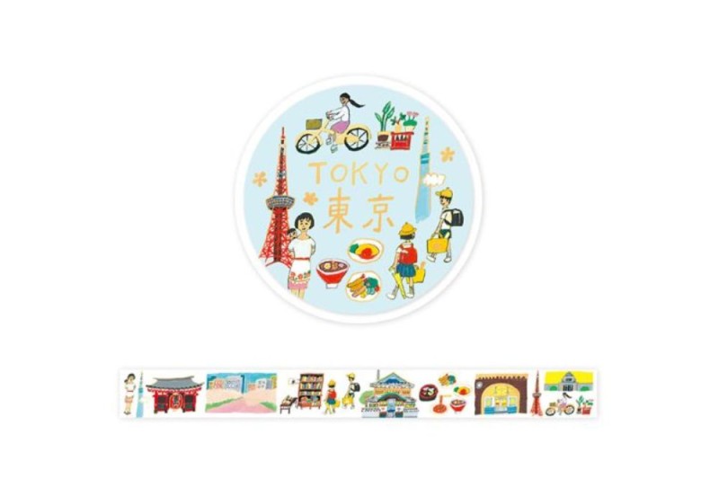 Stylowa taśma dekoracyjna typu masking tape ozdobiona motywem Tokyo - ilustracje związane z Tokio, charakterystyczne elementy miasta i jego atmosfery. Delikatne złote tłoczenia (foil) nadają wzorowi elegancki i subtelnie błyszczący efekt, dzięki czemu taśma świetnie sprawdzi się w projektach kreatywnych oraz dekoracyjnych.
