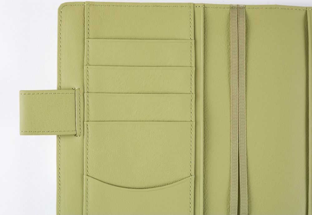 Posiada kilka mniejszych kieszonek na karty i wizytówki oraz większe do przechowywania biletów czy paragonów, a także uchwyt na długopis. Okładka zawiera dwie zakładki, jedną z prostokątnym uchwytem i jedną z trójkątnym w kolorze szałwiowym, dzięki czemu można zaznaczyć ważne miejsca w dwóch częściach książki, takich jak miesięczny kalendarz i codzienna strona. Wnętrze okładki jest również w kolorze szałwiowym, a na prawej kieszonce widoczne jest tłoczone na złoto logo marki HOBONICHI.