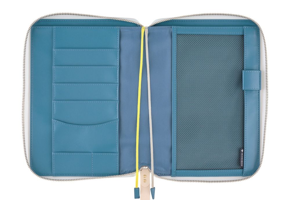 Wnętrze okładki jest w kolorze głębokiego błękitu. Posiada kilka mniejszych kieszonek na karty i wizytówki oraz większe do przechowywania biletów czy paragonów, a także uchwyt na długopis. Okładka zawiera dwie zakładki, jedną z prostokątnym uchwytem i jedną z trójkątnym w kolorze żółtym i szarym, dzięki czemu można zaznaczyć ważne miejsca w dwóch częściach książki, takich jak miesięczny kalendarz i codzienna strona. Posiada wygodne zamknięcie na zamek błyskawiczny, który jest wykonany z naturalnej skóry.