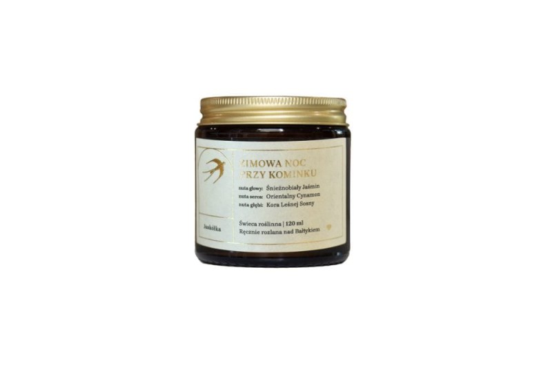 Świeca sojowa od Jaskółki o zapachu Zimowa Noc Przy Kominku to jesienno-zimowa receptura, w której wyczuwalne są takie nuty jak śnieżnobiały jaśmin, cynamon oraz kora leśnej sosny.