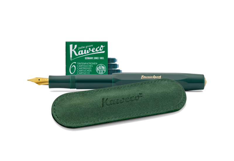 Taniej w zestawie!Elegancki zestaw z piórem wiecznym Kaweco Classic Sport w kolorze zielonym. W komplecie także naboje atramentowe w kolorze Palm Green i zielone etui pojedyncze.